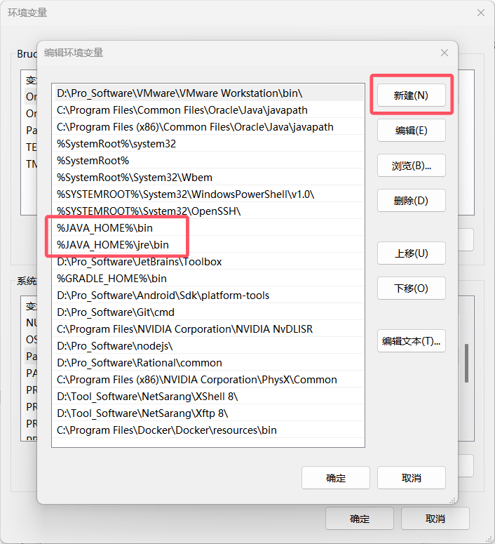 - 在“系统变量”中找到`Path`变量,点击“编辑”,在变量值末尾添加`%JAVA_HOME%\bin`、`%JAVA_HOME%\jre\bin`。